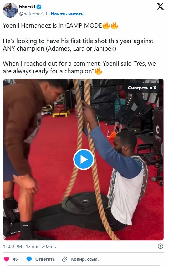 "Йоэнлис Эрнандес – в режиме подготовки. Он надеется получить свой первый титульный бой в этом году против любого чемпиона (Адамеса, Лары или Жанибека). Когда я обратился к нему за комментарием, Йоэнлис сказал: "Да, мы всегда готовы к чемпионам“, – написал bharski.