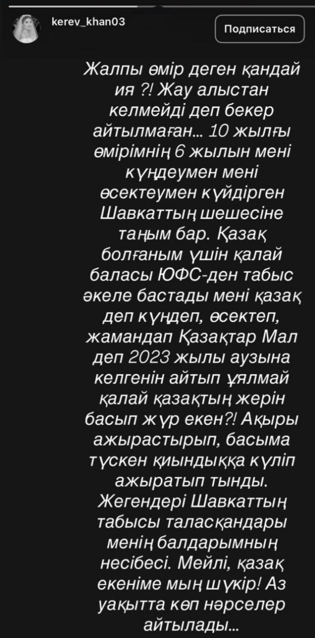“Что вообще такое жизнь?! Недаром говорят: враг не приходит издалека… Я поражаюсь матери Шавката – из 10 лет моей жизни 6 лет она сжигала меня сплетнями и постоянными упреками. Как только ее сын начал зарабатывать в UFC, она стала унижать меня… распускать слухи, говорить все, что вздумается… В итоге она добилась своего – разрушила нашу семью, смеялась над моими трудностями и довела до развода. Пользуются доходами Шавката, а делят то, что по праву предназначено моим детям… Со временем многое еще будет сказано”, – написала в соцсетях Гулайым Рахмонова.