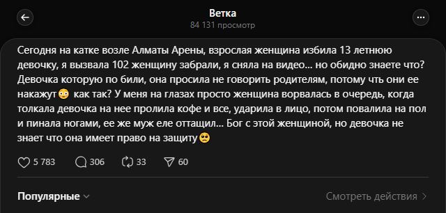 “Я вызвала 102, женщину забрали, я сняла на видео… Но обидно знаете что? Девочка, которую побили, она просила не говорить родителям, потому что они ее накажут. Как так? У меня на глазах просто женщина ворвалась в очередь, толкала девочку, на нее пролила кофе и все, ударила в лицо, потом повалила на пол”.