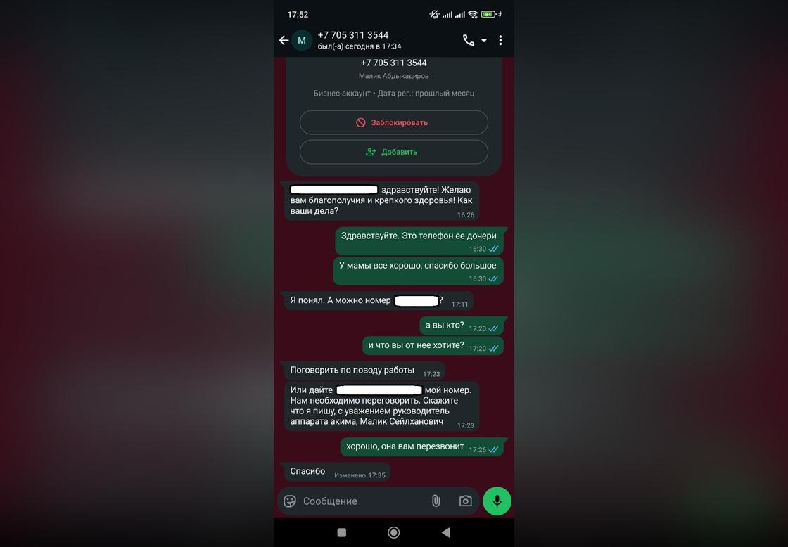 "Он написал моей маме, благо, у меня был в руках ее телефон. Представился, пишет, что насчет работы. Мне повезло, что я знаю Малика Абдыкадирова лично, поэтому сразу с ним связалась. Естественно, никому он такое не писал. Вот так другому мошенники напишут, и человек поверит. Неизвестно, что они хотели, но явно ничего хорошего", - сообщила женщина.