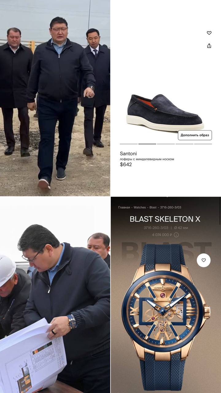 Берик УалиНа рабочем выезде акима области Абай Берика Уали заметили в замшевых лоферах Santoni за 642 доллара – это около 346 тысяч тенге. Но главным акцентом образа стали часы Ulysse Nardin Blast Skeleton X, цена которых составляет около 26,6 млн тенге.
